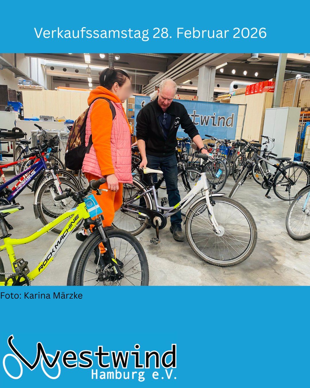 Christian Großeholz ist schon wieder zurück in der Verkaufshalle. Die nächste Kundin erwartet ihn. Ein Damenrad, 24 Zoll, grün – drei Gänge reichen ihr. Das Rad hat Großeholz eigenhändig repariert und er freut sich über das Interesse. Ungefähr alle drei Monate veranstaltet er mit Westwind einen Verkaufstag. Hier können alle vorbeikommen, die bedürftig sind. Sie dürfen sich aus der Menge an wiederaufbereiteten Rädern eines aussuchen und es direkt gegen einen kleinen Betrag mitnehmen. Für Kleinkinder kostet ein Rad nur 15€, für Kinder und Jugendliche 35€ und für Erwachsene 55€. Ein Bedürftigkeitsnachweis muss vorliegen.