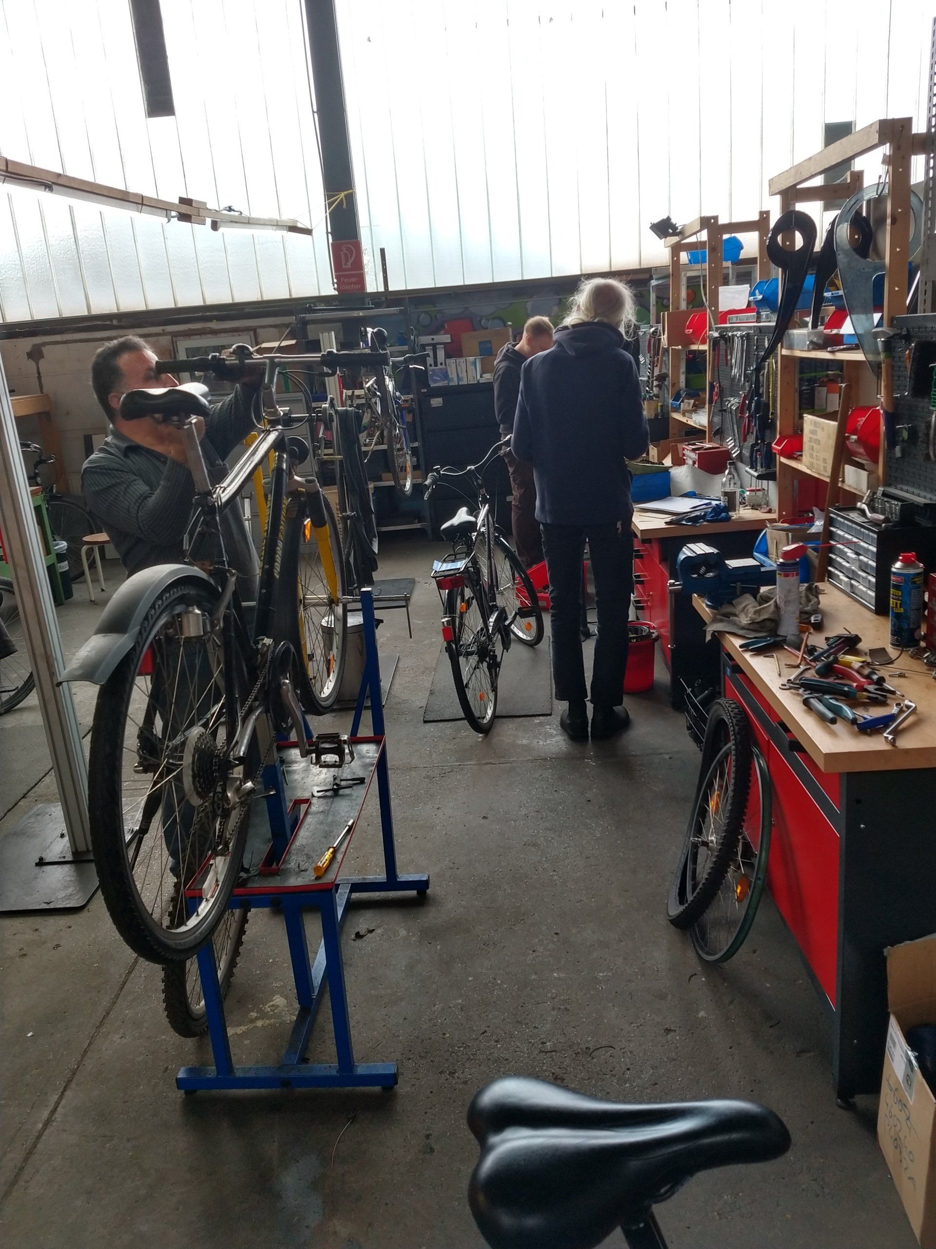 Das Schraublabor ist unsere Werkstatt in Bahrenfeld. Dort finden die Angebote des Vereins statt. Einheimische und geflüchtete Ehrenamtliche kommen hier zusammen, um gemeinsam alte Räder wieder fit zu machen. Hauptamtliche Mechaniker leiten die Ehrenamtlichen an, führen Workshops rund ums Fahrrad durch und sind mit Rat & Tat in der Selbsthilfewerkstatt zur Stelle. Bei gemeinsamen Aktivitäten findet kultureller Austausch und Spracherwerb statt.