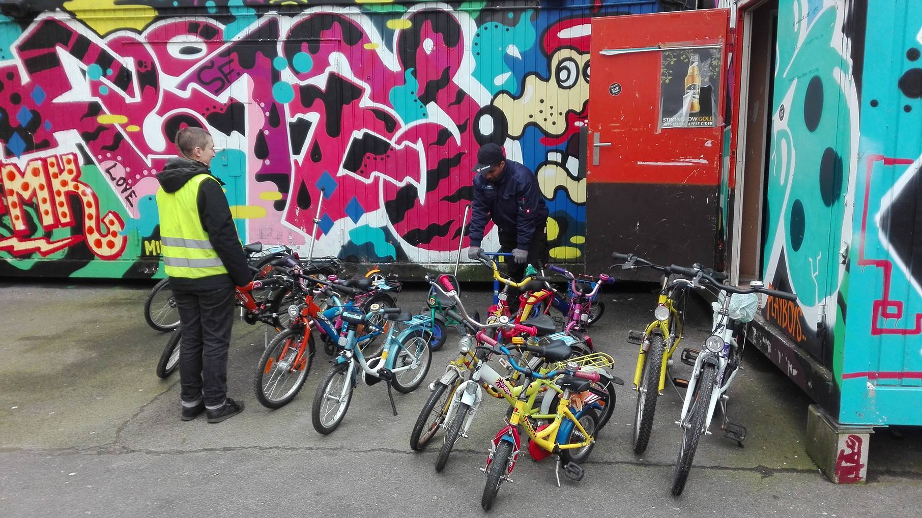 Unser Werkstatt-Team besucht mit unserem Cargobike regelmäßig Unterkünfte in Eimsbüttel um Kindern und Jugendlichen die Möglichkeit zu geben, unter Anleitung ihre Räder in Ordnung zu bringen. Ersatzteile haben wir dabei. Meist sind es Probleme mit der Lichtanlage, kaputte Züge von Bremsen und Schaltung sowie defekte Reifen und Schläuche.